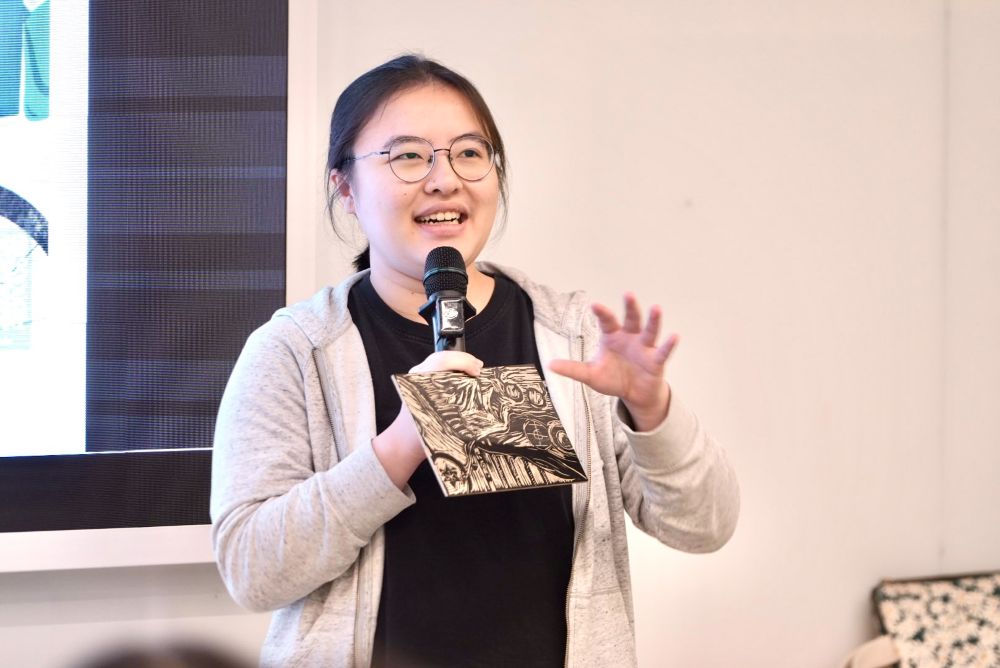 歷史所碩二謝采諭分享其作品《衣櫃驚魂夜》之創作歷程,發想源自白色恐怖受難者謝培元先生的經歷。四六事件發生時,謝培元雖未被捕,但普遍被認為曾參與其中。隔年,他因加入讀書會遭通緝,遂返回臺中兄長家中避難。不料藏匿處仍遭特務查獲,情急之下只能藏身於衣櫃。謝同學指出,作品下方以警帽意象隱喻特務的緝捕,上方則刻劃謝培元在狹窄黑暗的衣櫃中,那份惶恐焦急的面容。
