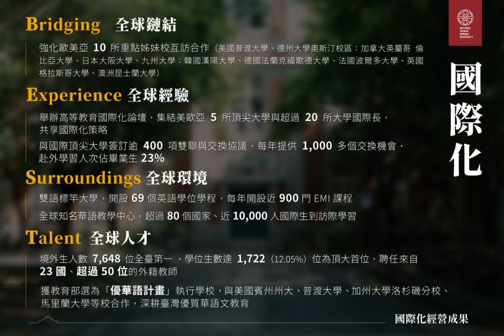 隨著全球化進程的加入與產業結構的不斷轉型,高等教育的國際化已成為連結臺灣與世界的關鍵推動力,面對日益多元的國際趨勢與區域合作,秉持著「NTNU:Global BEST」願景,臺師大將致力於「全球鏈結」(Bridging)、「全球人才」(Talent)、「全球經驗」(Experience)及「全球環境」(Surroundings)」,實踐學術共創、跨文化對話、環境營造、人才融合,奠定更具國際競爭力的學術環境,讓臺師大成為高等教育的國際化典範。[資料來源:師大新聞(國際處 / 撰文: 楊詠盛 / 攝影:張適 / 編輯:胡世澤 / 核稿:鄧麗君 )]