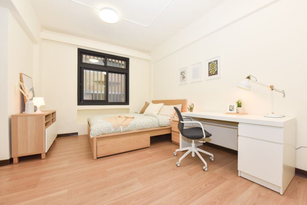 整體空間設計以「明亮、安全、獨立機能」為核心理念,採簡約典雅風格,動線規劃清楚,全面升級居住品質。室內裝修完成後,總務處另邀請IKEA家具設計師協助家具配置與擺設,營造貼近國際生活習慣、溫馨舒適的居住氛圍,也有助外籍教師快速融入校園與在地生活。