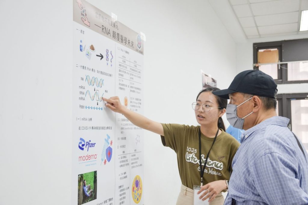 生命科學系課程涵蓋「生態與演化」、「生理學」及「細胞分子與分子醫學」三大主軸,重視學生基礎知識及研究方法的培養,鼓勵依據興趣探索未來方向,拓展學術與職涯出路。王昱程說明,本次海報展即是學生結合個人興趣所設計,並由學生親自講解,協助大眾理解水域生物、昆蟲、鳥類、植物與生醫等主題,成功將艱深知識轉化為易懂的科普內容。