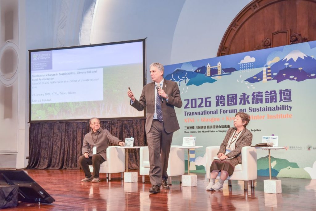 隨後,英國格拉斯哥大學社會與環境永續學院教授兼院長 Fabrice Renaud,分享氣候災害對沿海地區造成的衝擊,指出二十一世紀末海平面上升已導致部分地區出現海水入侵與農業鹽化的情形。他以蘇格蘭政府推動的綠色復甦框架為案例,說明透過漸進式調適與政策工具,降低氣候風險並強化社會韌性。