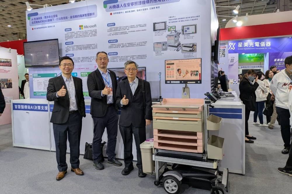 臺師大研究發展處林政宏副處長(左)、馬偕紀念醫院安寧療護教育示範中心嚴從毓主治醫師(中)、臺師大電機工程學系王偉彥教授(右)於展區合影,共同見證智慧照護技術的推動成果。
