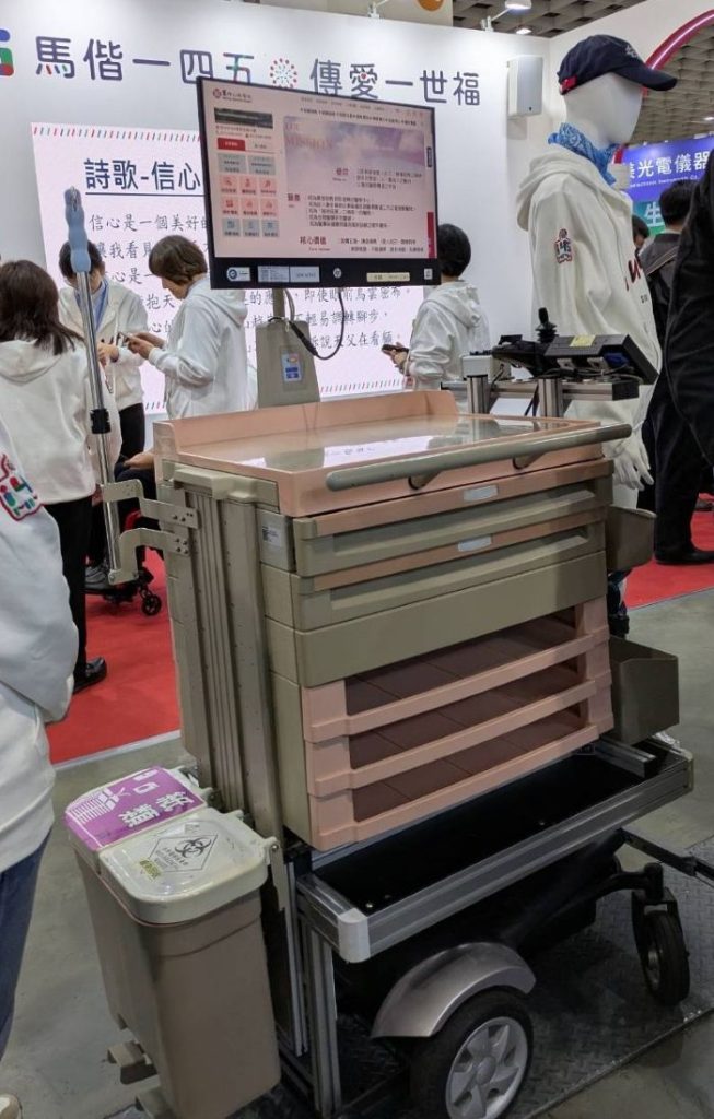 展出的智慧護理車整合自主移動導航、語音辨識、機器視覺與人工智慧分析等技術,可依照觸控指令或語音命令進行自主移動與跟隨,協助護理人員進行物資運送。系統中的語音輸入功能可即時轉譯並完成紀錄,減少護理人員在交班、記錄與資料整理上的時間,使照護流程更有效率。針對安寧照護現場中高度依賴紀錄與細緻照護的特性,智慧護理車可作為即時協作的輔助工具,提升護理人力運用與照護品質。