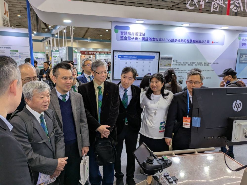 馬偕紀念醫院蕭聰穎董事長(左二)於展區由研究團隊陪同導覽,聽取智慧護理車技術研發與臨床應用的簡報說明。