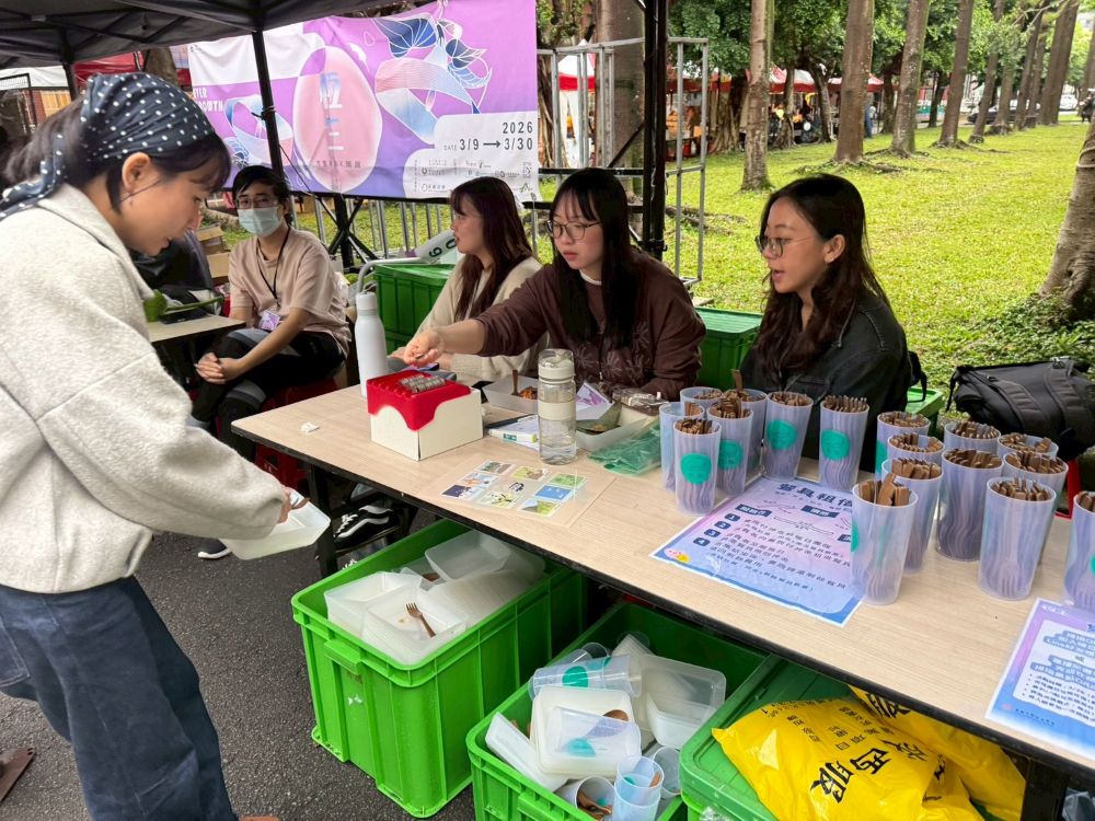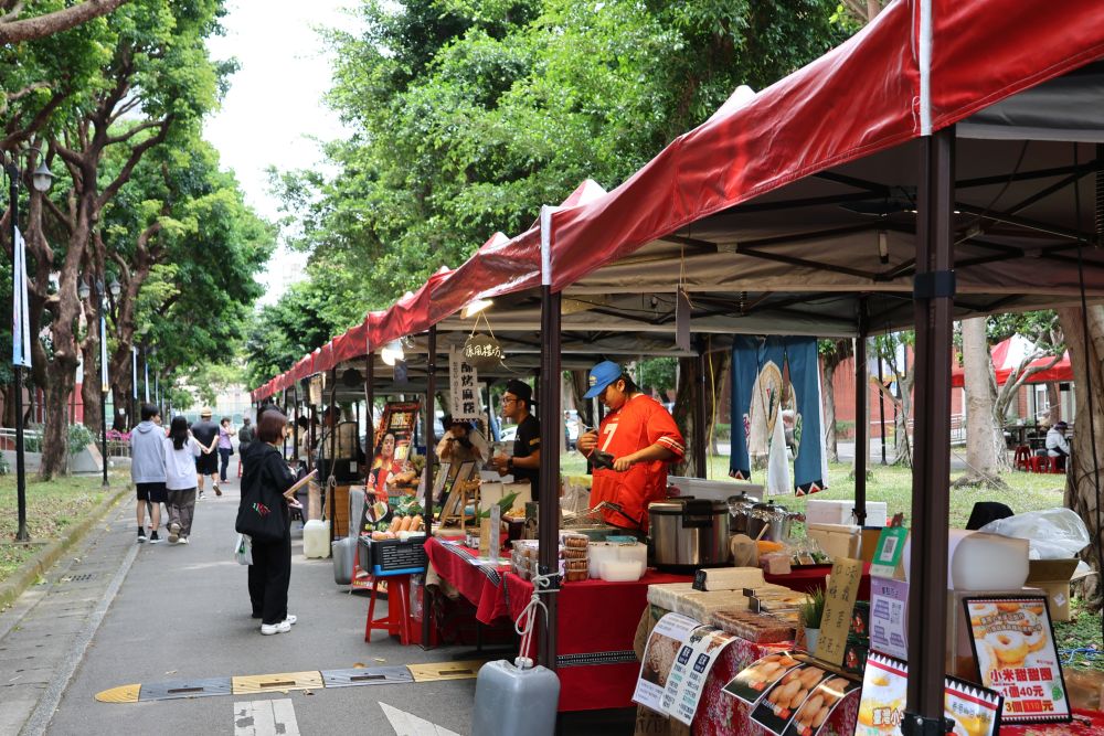 今年食物類攤商占比達三分之一,因篩選標準由全素調整為蛋奶素,吸引甜點類攤商參與,提升學生購買意願。現場集結各具特色的飲食品牌,如販售鹹水雞的「回憶殺童年趣」,配合市集無肉規範,以素雞、素甜不辣等品項參與;另有支持在地小農、販售桑椹原汁的「豪宇在地手作」;自外縣市遠道而來的台東「泰源幽谷獼米」、花蓮「夜市王 原香嘟論竹筒飯」、台中「The Bretzel 䴺樂所手工德國扭結」等多種不同美食,為市集帶來豐富面貌。