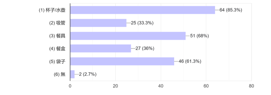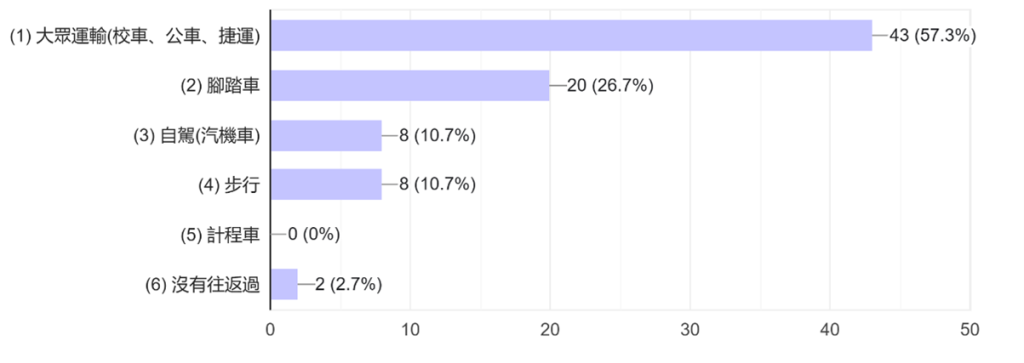 行為題型共設計3題,從交通方式、減塑行為及行動參與三個面向,了解校內人員的永續行動程度與參與意願。在交通方面,針對「往返和平與公館校區的交通方式」進行調查,結果顯示超過九成受測者選擇搭乘大眾運輸(校車、公車、捷運)、騎乘腳踏車或步行,顯示本校教職員生以環境友善交通方式為主要選擇。在減塑行為方面,調查「在校園中自備的可重複使用環保用品」,以攜帶杯子或水壺比例最高,達85%;其次為餐具與環保袋,皆有超過六成受測者攜帶;相較之下,自備吸管與餐盒者約三成,推測可能與清洗不便有關,整體而言多數校內人員已具備良好的環保用品使用習慣。在行動參與方面,調查「有意願參與的永續活動主題」,涵蓋環境永續、社會永續、經濟永續及治理與政策等面向,其中以環境永續最受青睞(72%),治理與政策則相對較低(24%)。本次調查結果可作為學校未來規劃永續相關活動的重要參考依據,並有助於掌握校內整體永續文化發展現況。