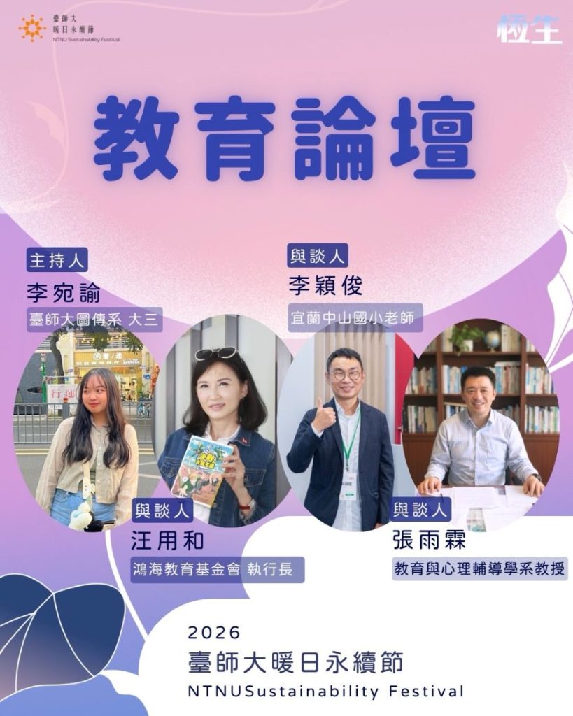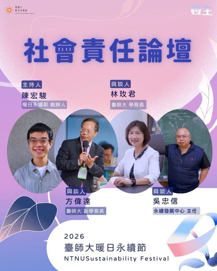 邀請環安衛中心暨永續發展中心主任吳忠信、副教務長暨通識教育中心主任方偉達、學務長林玫君,主持人為永續出師暨暖日永續節創辦人、臺師大第28屆學生會理事長陳宏駿。在氣候變遷、產業轉型與社會快速變動的時代,「永續」不再只是政策或口號,而正在重新定義大學教育與未來人才的樣貌。透過邀請三位長期投入校園治理、課程設計與學生事務的三位師長,回應大學教育應該如何回應社會議題與永續挑戰。