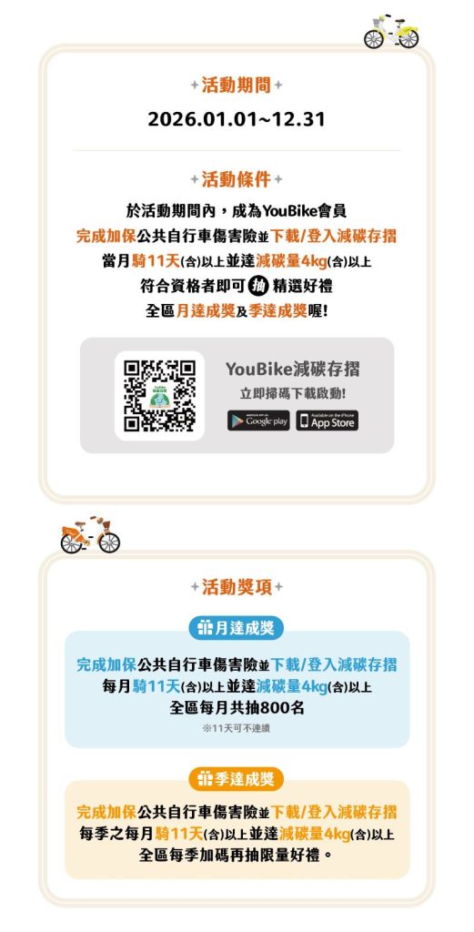 每會員帳號下,單月累計總騎乘天數達11天(含)以上,且減碳量達4公斤(含)以上者,即符合月月抽活動抽獎資格。