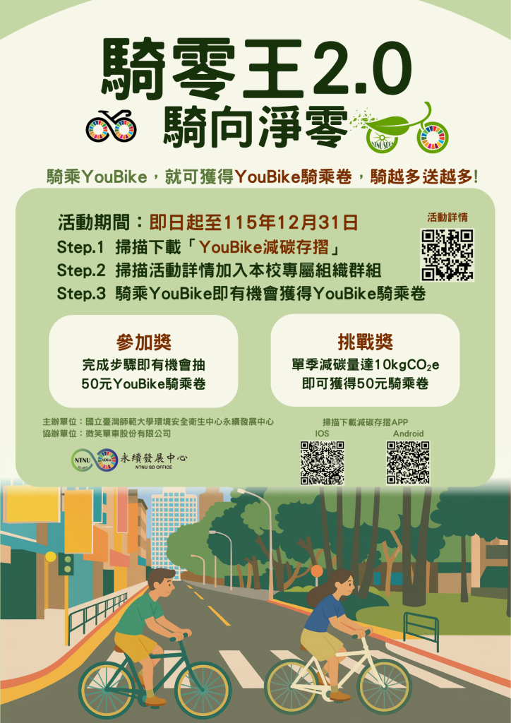 為響應淨零綠生活政策,以及鼓勵校內運動風氣,特辦理「騎零王-騎向淨零」活動(以下簡稱本活動),鼓勵全校教職員工生於日常通勤中多加使用公共自行車,在促進身心健康之餘,也以實際行動減緩氣候變遷,攜手打造永續校園。